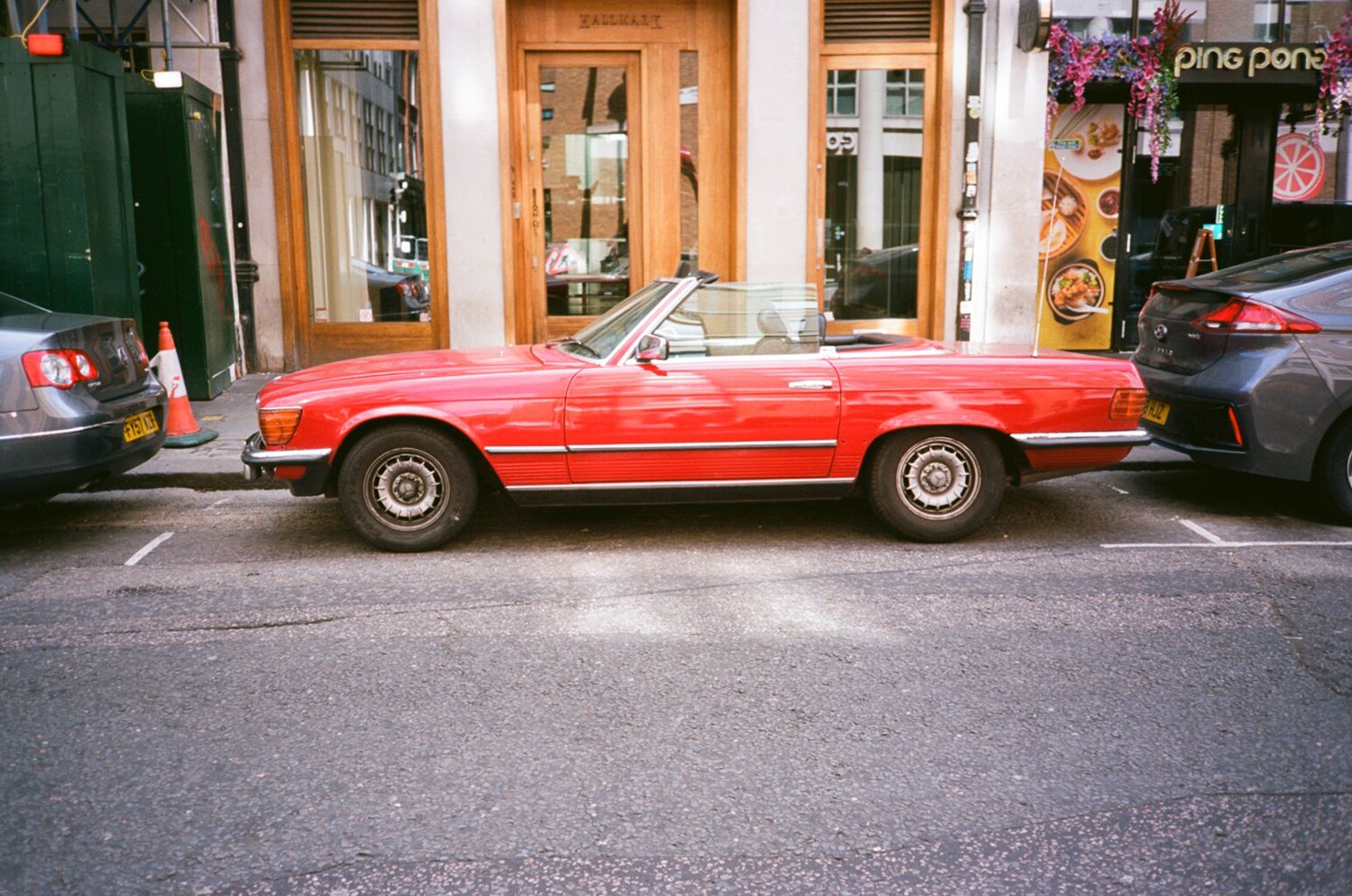 Rich red retro roadster in central London shot on Kodak Ektar 100