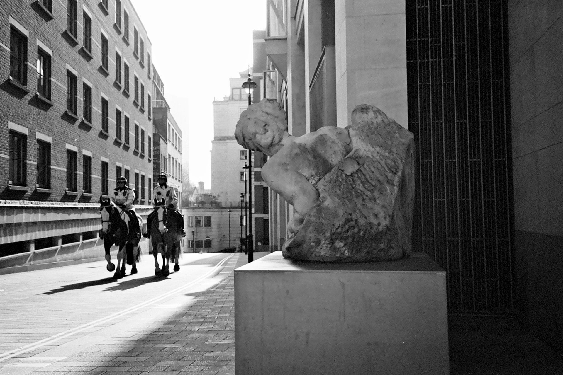 Peeking statue looks at police horses, also on an Olympus Mju-I