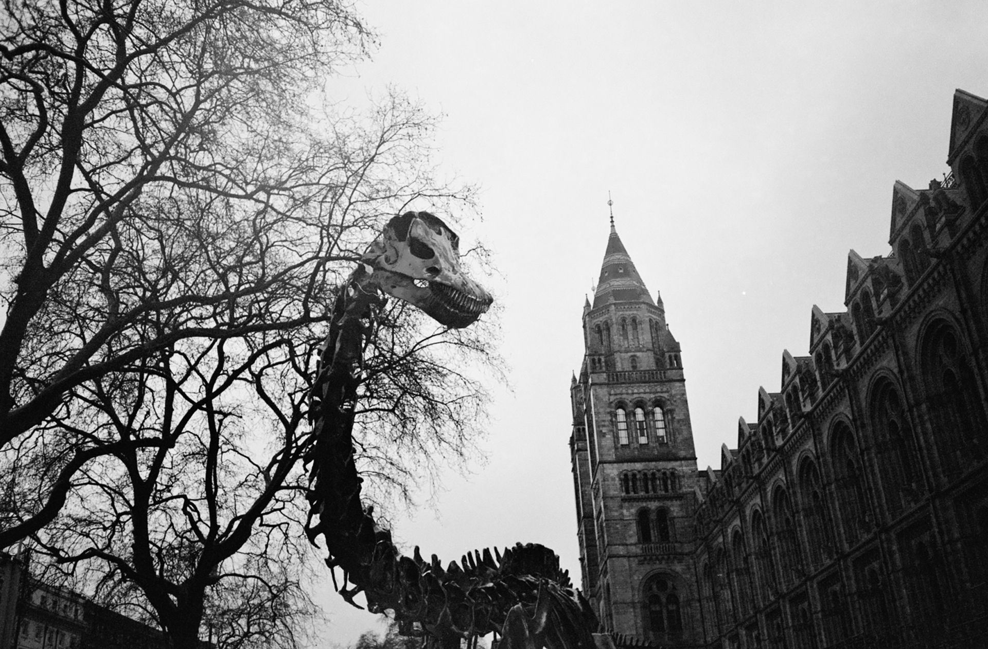 Dino smile outside the Natural History Museum on an Olympus Mju-I